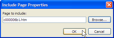 Fig. 1-5 Selecting the Page (typical)After the component and content type are selected, it is necessary to locate the page whose content provides the component (fig. 1-3). Browse to the page in the construction section of the site (fig. 1-4). When the page is located, its relative location will appear in the Include Page Properties dialog box (fig. 1-5). Accept the selection to have the table element appear in the location that is selected in the current HTML page's Design View.