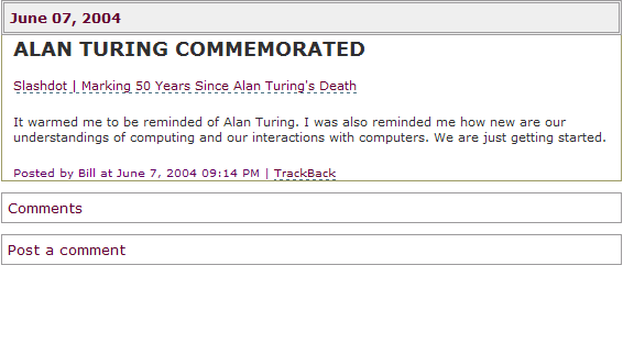 2004-06-27 | There are some incoherences in Blogger with regard to the templates and the different things that happen. For example, some templates, maybe old ones, don't show the stored title for the entry, so I have been putting in headings by hand. This leads to double titles when other templates are used. Also, the interpretation of <blockquote> and the association of colors and fonts with various styles from template to template leads to incoherence around what tags mean to authors and users and whatever they meant to Blogger template designers. For example, the dissonance between Rounders 3 and Rounders 2 is startling. I also notice that there is incoherence in comments versus posts, including the relaying of URLs in comments. On a post page, the Preceding Posts really are preceding posts. On the default page, they are recent posts, including the most-recent. The archive list does not appear on a post page, but it does appear on the default page. Likewise, there can be comments on the default and the post or just on the post. I haven't looked at the archive page case yet. | |